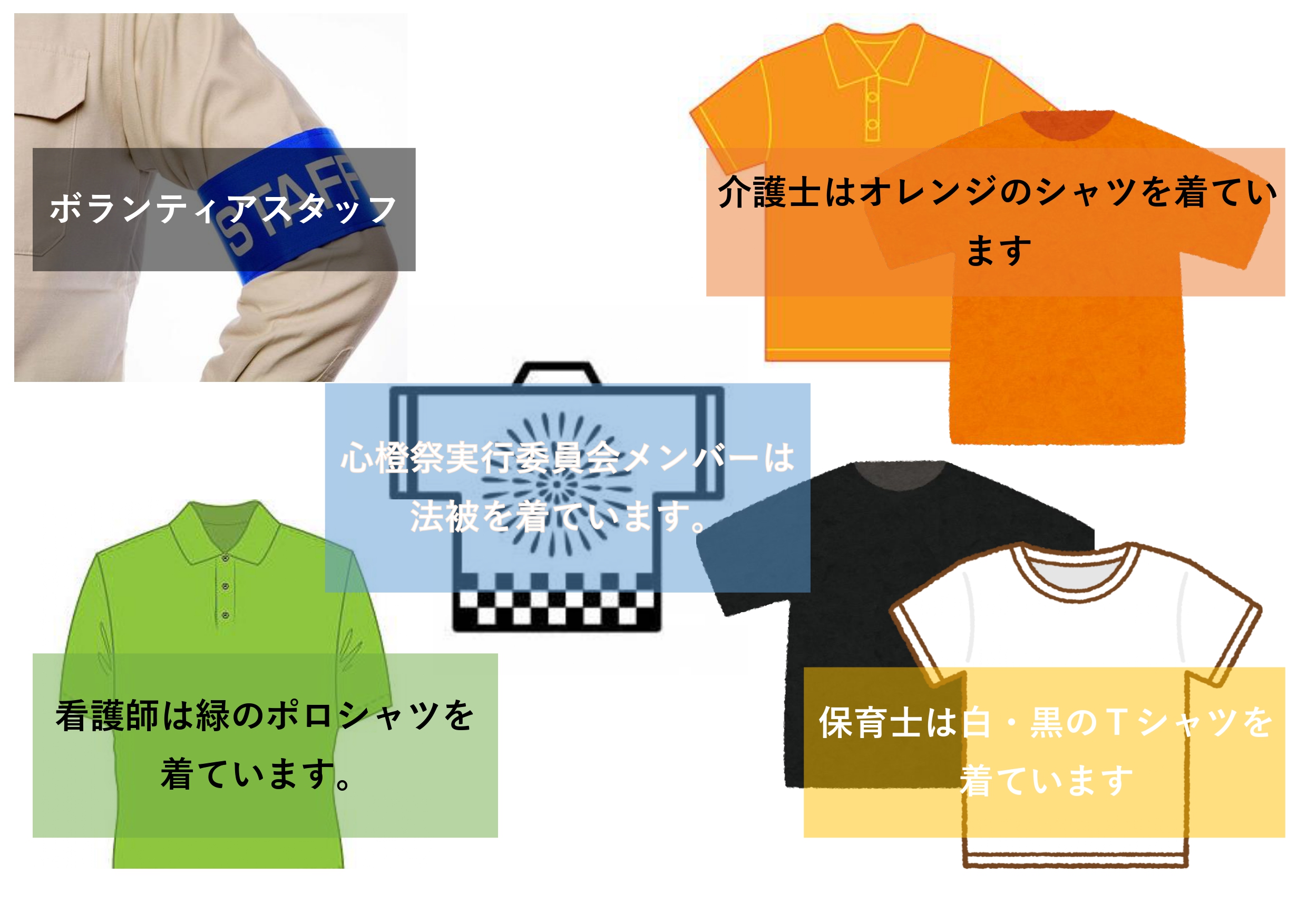 🍊心橙祭 各職種の制服について 2025年10月7日 心橙祭 当日の職員ユニフォームについて 心橙祭当日は、職種ごとに異なるユニフォームを着用しています。 お困りのことがありましたら、お近くの職員までお気軽にお声かけください🍀 👕 介護士:オレンジのシャツ 👕 看護師:緑のポロシャツ 👕 保育士:白または黒のTシャツ 👕 ボランティアスタッフ:青い腕章(ボランティアスタッフと表示) 👘 心橙祭実行委員会メンバー:法被(はっぴ)を着用 それぞれが役割を分担し、皆さまに安心して楽しんでいただけるよう準備しています。 どうぞ安心してご参加ください😊✨