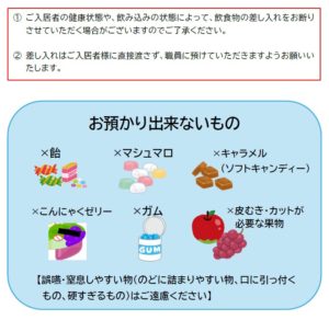 - 飲食:職員がお預かりできないものは下記をご参照ください。職員は同席しないため、 喉に詰めないよう安全に召し上がってください。また面会中は事故のないようご注意ください。